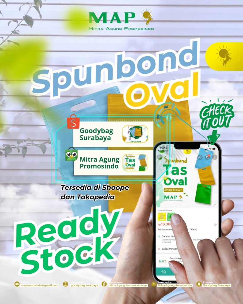 Mitra agung promosindo kini telah tersedia di marketplace yaitu shopee dan Tokopedia, beberapa barang ready stock telah tersedia dijual, salah satunya adalah tas spunbond oval, tas yang tersedia dalam 4 pilihan warna dengan ukuran 25×20 cm.
