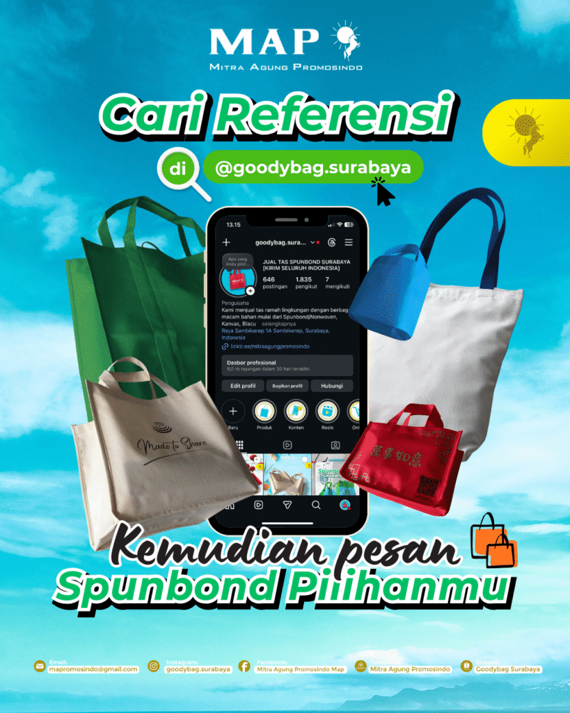 Setelah menemukan model yang cocok di @goodybag.surabaya, langkah selanjutnya adalah mewujudkannya. Mitra Agung Promosindo adalah produsen spesialis yang sudah berpengalaman menangani ribuan pesanan tas spunbond.