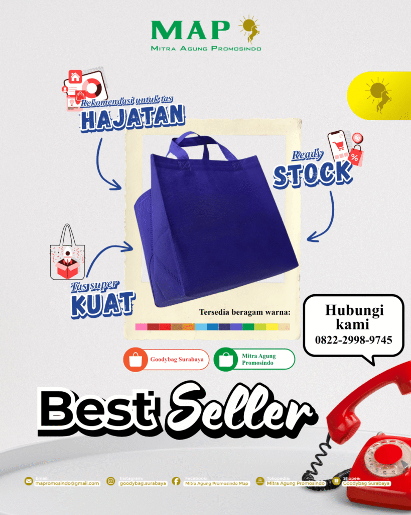 Kami memahami bahwa terkadang kebutuhan datang secara mendadak. Di Mitra Agung Promosindo, kami menyediakan berbagai varian tas ready stock yang siap kirim atau siap sablon dalam waktu singkat. Anda tidak perlu menunggu lama untuk proses produksi dari nol jika membutuhkan tas dalam waktu cepat.