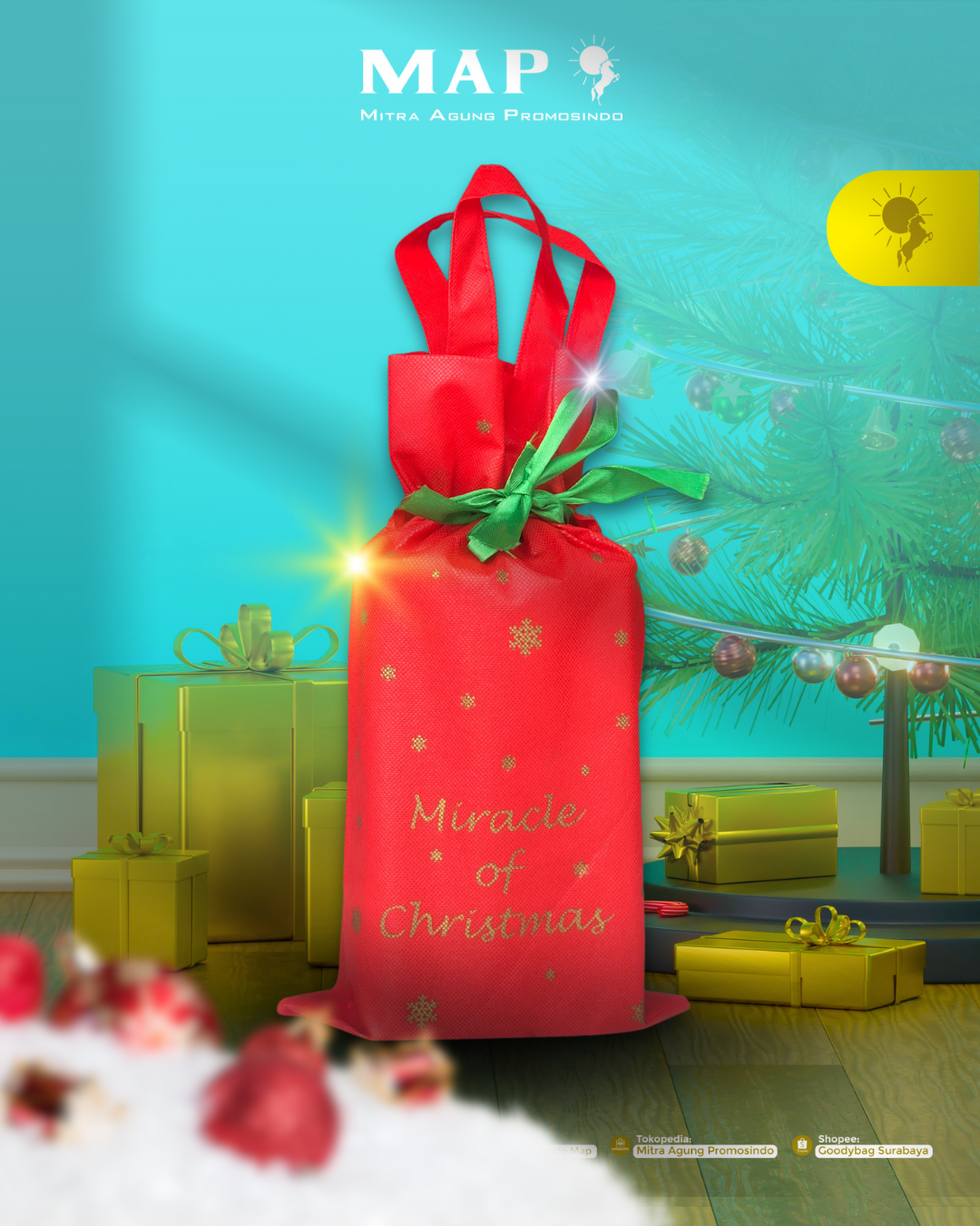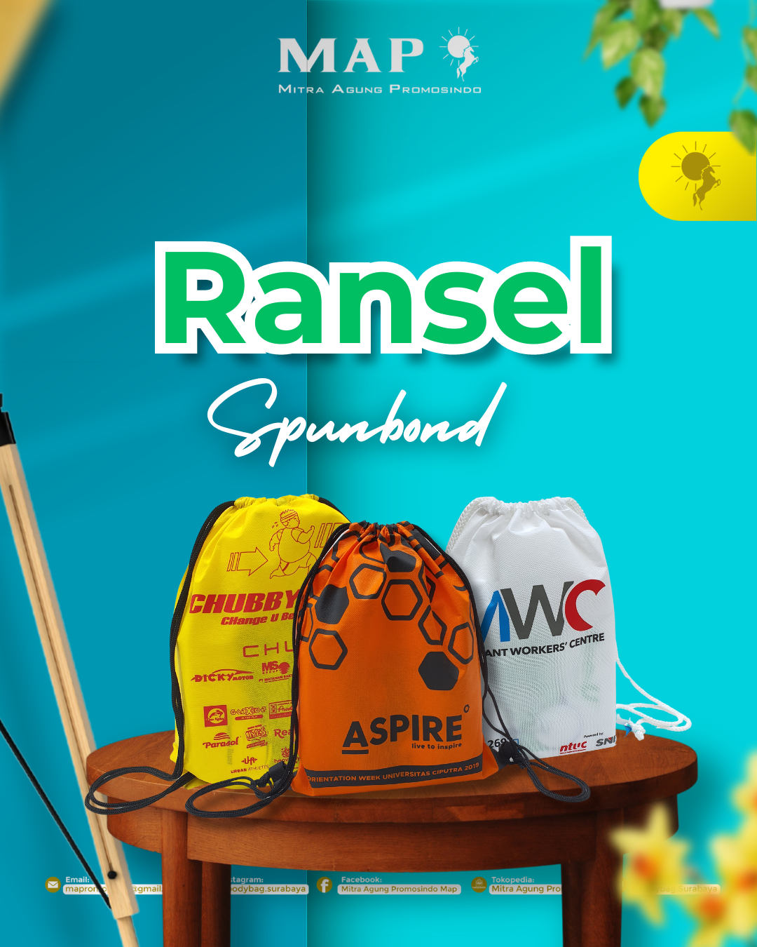 Jenis Tas Spundbond yang di custom dengan tambahan tali serut sebagai penutup tas. Tas jenis ini cocok untuk merchandise atau tempat bingkisan di event kamu