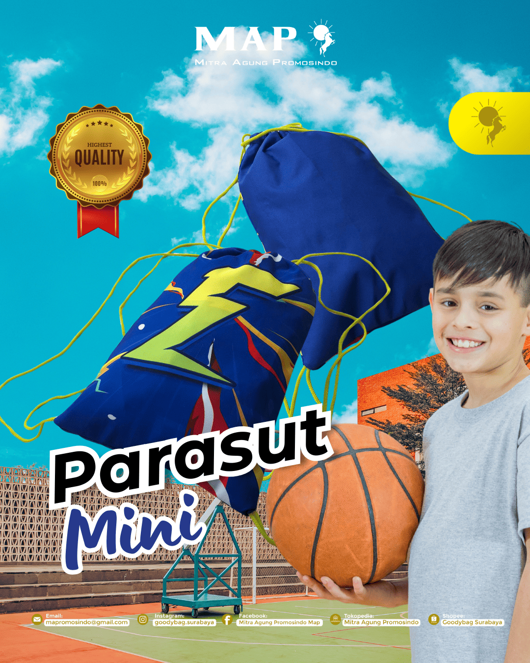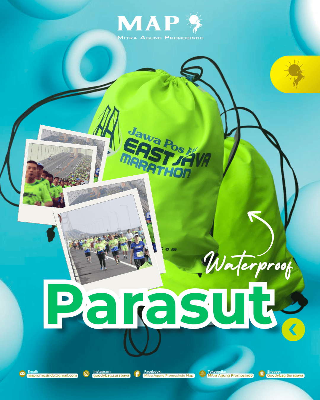 Kain parasut adalah jenis kain yang sangat kuat dan tahan air, terbuat dari nilon atau polyester yang diatur dalam jalinan yang kuat. Tas ini biasa digunakan untuk event running dan termasuk jenis kain yang kuat dan tahan lama.